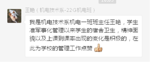 学生管理服务中心主任崔嵬表示:“通过准军事化管理,全校师生的精神风貌、行为习惯都得到了较大提升。准军事化管理的实施,使我们的班主任老师将工作重点放在如何做好学生的思政教育上来,将精力聚焦在如何组织更多形式的德育活动中来。准军事化管理是学院在学生管理工作中一次大胆的尝试,我们将不断总结经验,继续创新,相信不久的将来,学生管理工作将取得跨越式进步”。