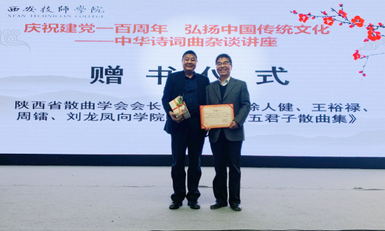 讲座分为两个环节。第一环节为赠书仪式,李稳贤先生代表徐人健、王裕禄、周镭、刘龙凤向学院赠送《五君子散曲集》,范孝红书记向李稳贤先生等五人颁发“《五君子散曲集》珍藏证书”。《五君子散曲集》将珍藏在学院图书馆,必将在服务师生,知往鉴今,惠及社会方面发挥积极作用。