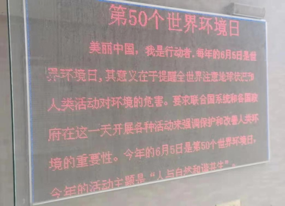 利用电子屏滚动播放环保知识。为了扩大本次活动的影响力,增强宣传效果,由学院后勤资产管理服务中心提供宣传资料,党群纪检处安排专人,利用E座电子屏滚动播放环保知识,让全院师生明确今年世界环境日的主题,掌握相关环保知识。