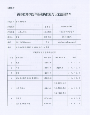 日前,经西安市人力资源和社会保障局备案评估,西安技师学院获得西安市首批社会培训评价组织资格,可面向社会劳动力开展电工、车工、钳工、汽车维修工、保育员、高低压电器成套设备装配工和变压器互感器制造工等七个工种的职业技能等级认定工作。