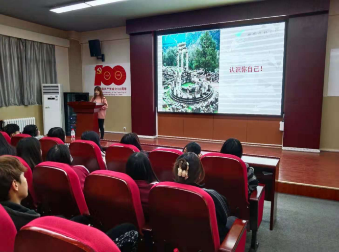 讲座开始,常薇老师首先从“认识你自己”进入,让同学们认真思考,迅速进入听讲座的状态。常薇老师依据多年的从业经验,向同学们生动具体的讲解了自我认知、自我体验、自我控制等知识,并向在场的老师及学生介绍了正确认识自我的方法。