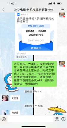 各班级班主任利用家长微信群、腾讯会议、QQ群课堂等形式认真召开了家长会,主要内容包括:介绍西安疫情防控动态形和防控政策、学院疫情防控措施、家长在疫情防控方面的优势等三方面。为了最大程度取得会议效果,各班主任提前准备了宣讲材料,详细向家长介绍了封校以来学生管理工作开展的情况以及学生在校表现,帮助家长明确西安目前疫情防控的形势和下一步防疫工作趋势,让家长了解学院采取有力的疫情防控措施,动员家长发挥亲情优势鼓励学生,形成家校疫情防控合力,保障学生在校身体健康,安全稳定。