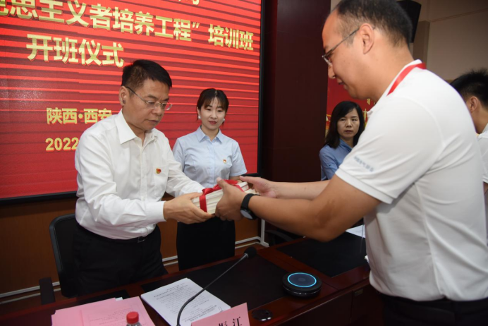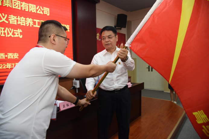 中国电气装备集团有限公司党委副书记裴振江向来自中国西电集团有限公司的学员代表王少博授班旗,并向学员赠送了量身配备的学习书籍。