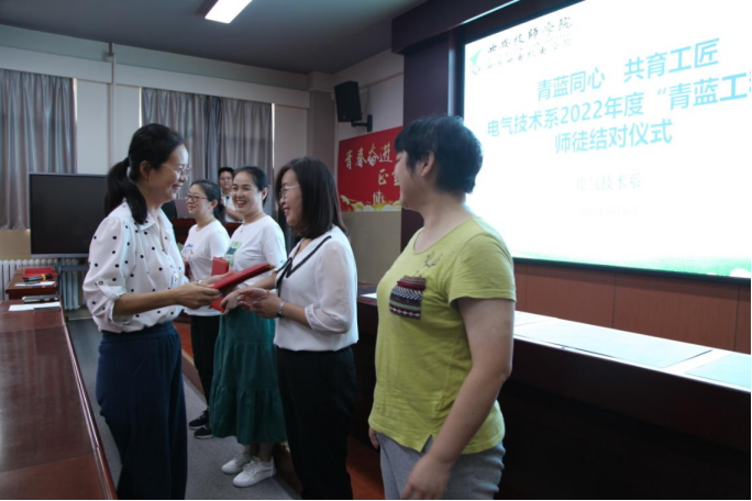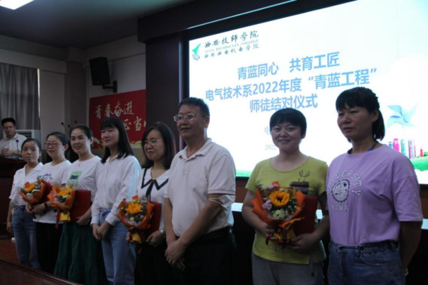 师徒结对仪式上,门新会副主任宣布了本年度“青蓝工程”师徒结对名单,4对“师徒”签订了《师徒结对协议书》,明确师徒责任,新入职电气技术系的4位教师与系部4位优秀老教师正式拜师结对。随后,门新会主任向老教师颁发了聘书,4位“徒弟”向“师傅”献花。