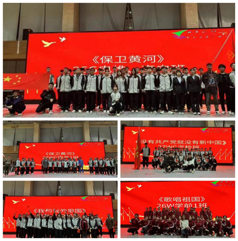 比赛在27WG电气1班演唱的《保卫黄河》大合唱中拉开序幕,各系参赛队依次上场,师生们用一首首经典的红色旋律,深情表达对党、对祖国和人民的热爱。
