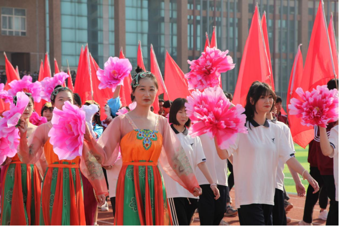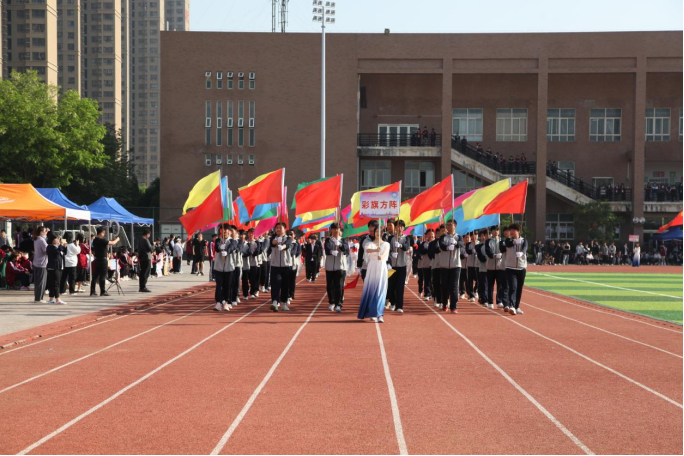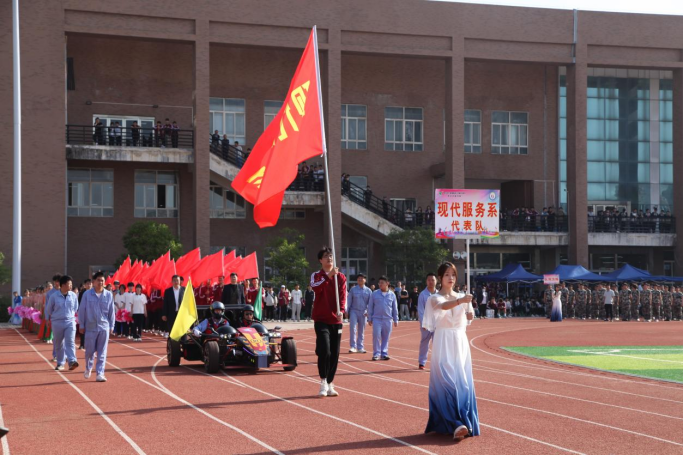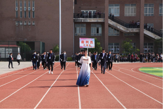 入场式开始后,国旗护卫队及会徽队、各系青年学生代表队、裁判员代表队方阵迈着整齐的步伐,喊着嘹亮的口号以饱满的精神状态行依次走过观礼台。一方阵,一主题,师生们用特色鲜明的方阵表演展示了全体师生爱国爱党爱校的真挚情感和昂扬向上的精神风貌。