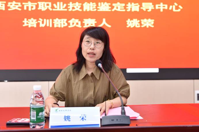 西安市职业技能鉴定指导中心培训部负责人姚荣针对职业培训项目进行了政策宣讲,对培训班从开班、培训过程以及考核给予了高度肯定。在肯定成绩的同时,她也鼓励学院今后能够为更多的学生开展技能培训,通过培训,形成市场配置、政府促进、管理规范的就业形势,有效提升就业人员的职业竞争力。