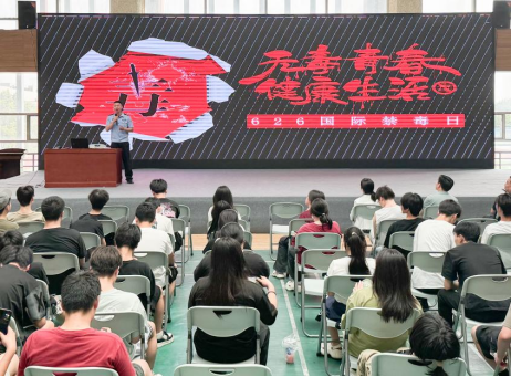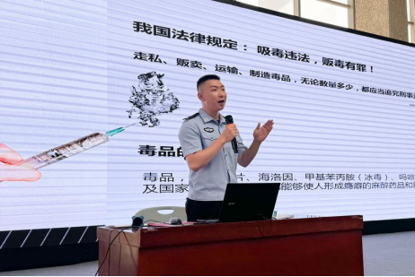 活动现场播放视频教育短片《知否(禁毒版)》。西安市强制隔离戒毒所王警官以《防范药物滥用守护无毒青春》为主题为现场师生授课。他通过丰富的毒品案例生动形象地为全体师生讲解了什么是毒品、概括了毒品依赖性、非法性、危害性的特点,并提醒广大学生不要因为好奇、无知,误入歧途。