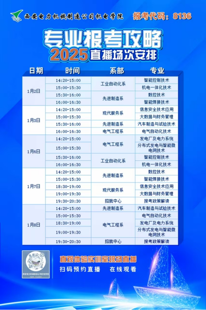 本次直播活动一期将于2025年1月2日至8日进行,涵盖机电一体化技术、电气自动化技术、汽车制造与试验技术、发电厂及电力系统、分布式发电与智能微电网技术、数控技术、智能焊接技术、智能控制技术、信息安全技术应用、大数据与财务管理10个热门专业。
