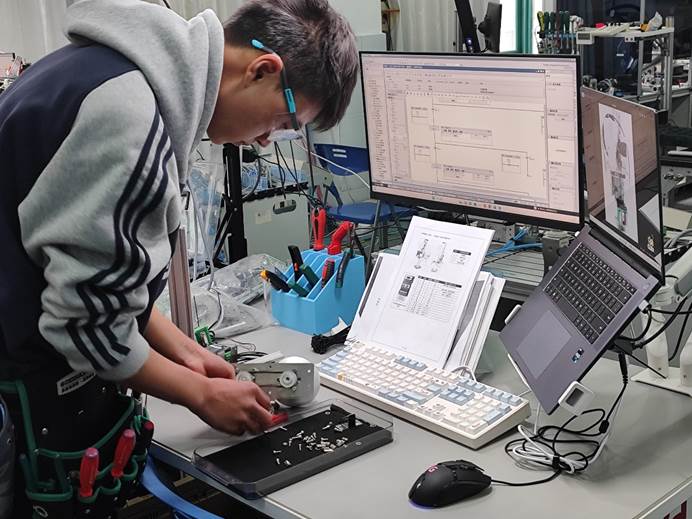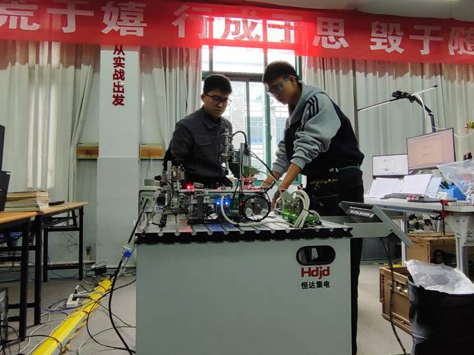 备赛之路并非一帆风顺。面对高强度的训练和复杂的技术难题,选手们遇到了诸多挑战。机电一体化大赛涉及机械设计、电气控制、自动化编程、触摸屏技术等多个领域,每一个环节都需要精益求精。“有时候为了调试一个程序,我们会在实验室里待到深夜。”苟群伟说,“但每当看到设备成功运行,那种成就感就会驱散所有的疲惫。”在备赛期间,他们放弃了休息时间,牺牲了与家人朋友相聚的时光,全身心投入训练中。正是这种坚持和毅力,让他们在技术上不断突破,逐渐成长为赛场上的佼佼者。