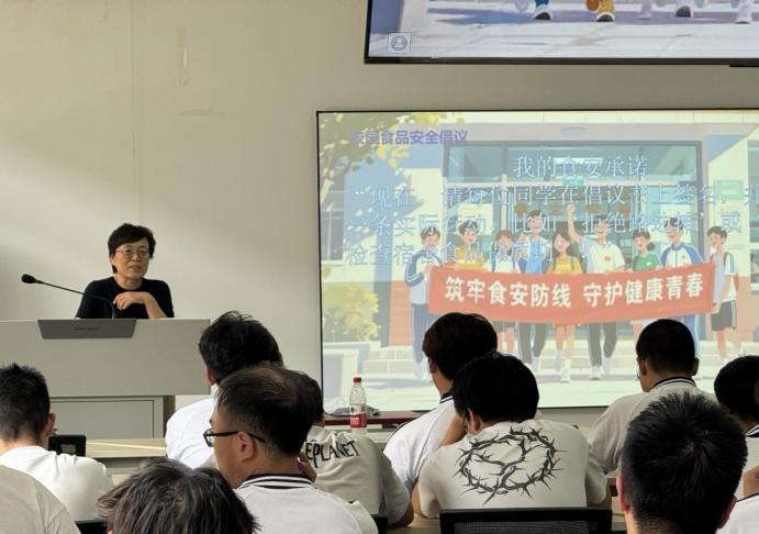 27G电气4班王红丽老师则聚焦食品选购规范,班长张子谦详解“五看原则”,针对外卖消费提出“查封签、留样本、拒三无”九字口诀。通过食堂负责人访谈视频、学生自编情景剧等多种形式,生动普及安全知识。全班同学共同签署《校园食品安全倡议书》,承诺从自身做起守护饮食安全。