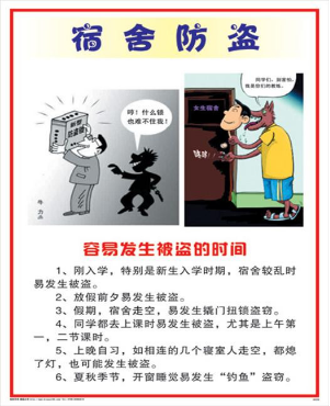 随着经济条件的不断改善,学生手中的零用钱越来越多,手机、数码相机、IPAD等一应俱全。这就使社会上不法分子把目光盯住学校,有的抢劫、盗窃团伙专“吃”高校。一些学生又不按规定保管公、私财物,使犯罪分子作案易于得手。预防和打击校园盗窃是每个在校学生应尽的责任和义务。增强防盗意识,了解校园内盗窃犯罪的基本情况、规律和特点,掌握防盗的基本常识,是做好防盗、保证安全的基础。