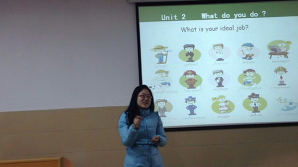 韩璟老师在讲“What do you do?”设计合理、展示直观的职业介绍以及情景导入使单调乏味的语言学习也植入了德育教育和人文关怀。