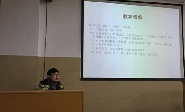 韦京利老师在讲“实事求是”,韦老师绘声绘色的情景教学法使原本枯涩的思想政治课活泼有趣、充实饱满,学生在轻松愉快的气氛中切实提升了自身的思想意识。