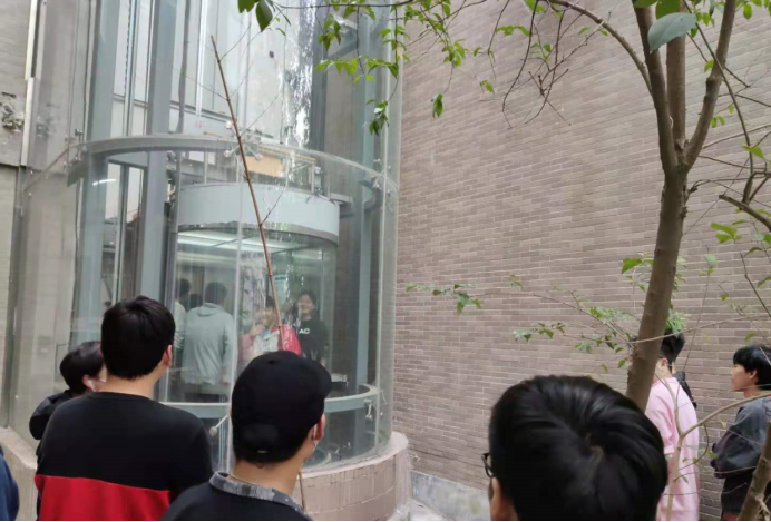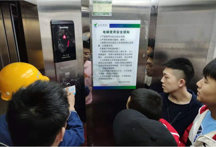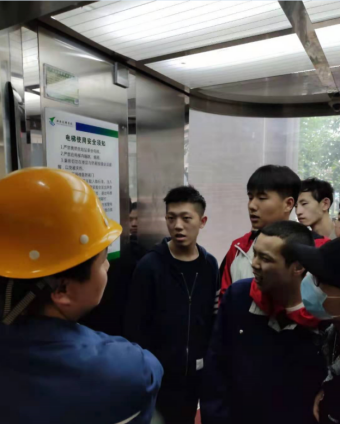 陈助理在轿厢内给师生讲解电梯轿厢内相关标志的作用、出现事故的应急处理措施以及多种求救信号安全发送的方法。