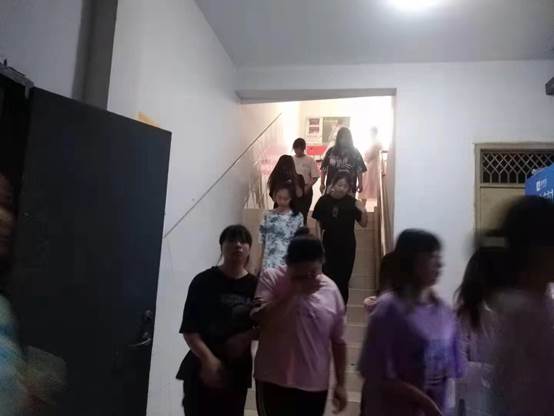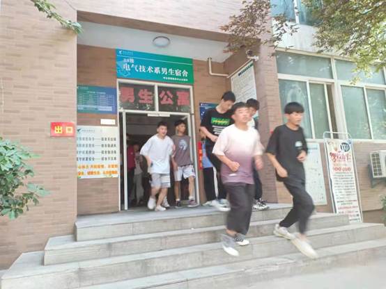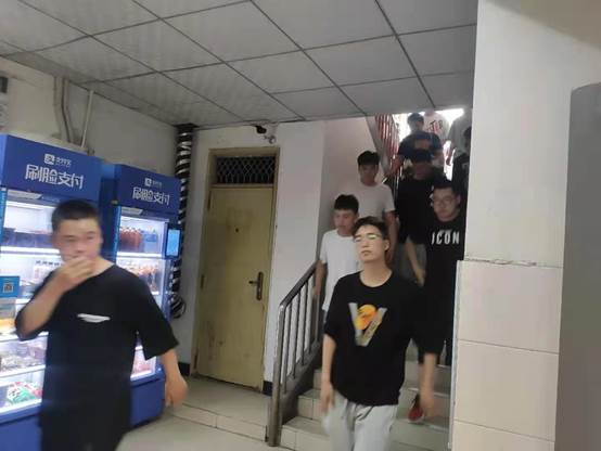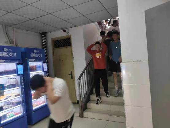 演练期间,学生们在宿舍听到逃生信号,应急管理人员组织学生从各自公寓楼内有序向集结点撤离,班主任、教官断后逐个清理楼层,最后撤离现场。