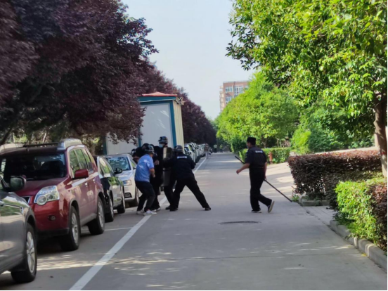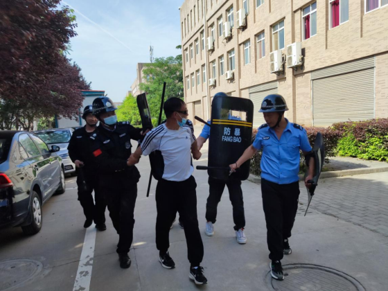 演练开始后,由参训人员模拟一名不明身份男子,手持凶器闯入校园,当保卫部门发出紧急通报时,校内其他安保人员迅速赶到现场,利用防暴器材,将其进行有效控制。在附近正在上实习课的学生闻讯后立即赶往现场进行支援,制服“歹徒”。