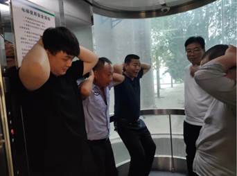 电梯脱困演练正式开始。学生在正常使用电梯时,出现突发情况,电梯突然停止运行,轿厢内学生全部被困,被困人员拨打救援电话,现场老师一方面联系电梯维保公司实施救援,一方面对被困人员情绪、心理进行安抚,对被困人员进行指导,靠墙、半蹲、抱头进行现场自救。电梯维保公司接到救援电话后第一时间到达现场,实施救援,最后将被困人员安全解救。