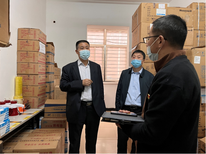 孙占亚副书记一行深入学院大门口、教学区、食堂、宿舍、防疫物资储备室等重点场所,现场查看了校园疫情防控措施落实情况,详细了解了疫情期间校园管理、应急处置等情况,重点检查了门卫值勤、各系教学区防疫准备、学院防疫物资储备以及学生宿舍消杀等,对存在的问题进行了现场反馈,并就疫情防控工作提出具体要求。