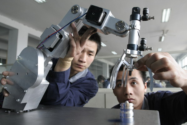 学院预备技师班学生开展项目教学调试自己设计制作的多功能机械手
