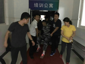 (图为学生工作处处长崔嵬(右一)带领工作人员和学生抬着受伤学生去医院接受治疗)