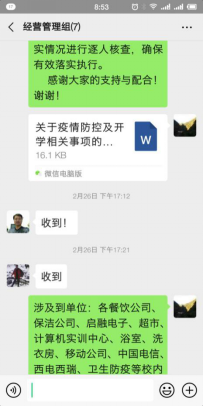 会议首先结合《关于切实做好食堂安全管理的通知》、《2020年保洁、食堂、培训公寓、商户等疫情防控及春季开学相关准备工作的通知》、《疫情防控及新学期开学保障工作措施落实明细表》以及《关于疫情防控及开学相关事项的通知》要求,对保洁、食堂、超市、商铺、联合办学等贯彻执行党中央、省市主管部门和学院有关疫情防控和开学相关工作前阶段执行情况进行了逐项逐人检查,以确保各项工作有目标、有安排、有落实、有检查、有提升。