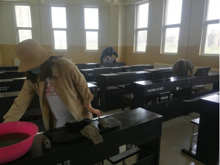 布满灰尘的教室,经过老师们一天的努力工作变得焕然一新。李治军等一些年龄较大的老师们不怕脏和累,冲拖把,扫地,擦桌子;孙依盈老师是一位准妈妈也在接水扫地努力打扫,所有的老师们都是为了学生开学以后有一个干净整洁安全的学习环境在不遗余力地努力。让我们为他们毅然返校提前进行的消杀工作大大地点赞。