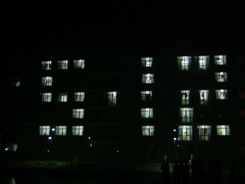 5月12日晚8:30校区公寓楼熄灯,用宿舍灯光打出5.12数字,这是一个让人们永远铭记在心底的时刻,一个将悲痛和泪水载入史册的时刻;