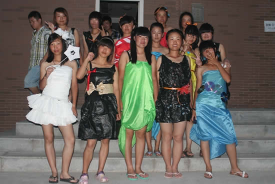 卫生纸、塑料袋、彩旗、光盘、床单……这些就是我们时装秀的素材