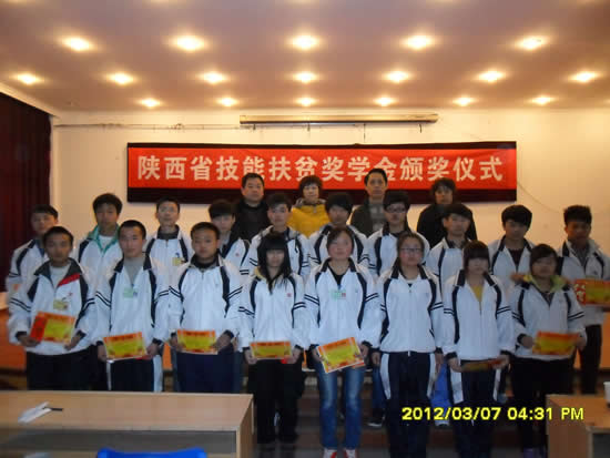 2011年3月7日,学生工作处于两校区同时进行了“陕西省技能扶贫助学基金会奖学金”颁奖仪式,旨在激励我院品学兼优、家庭贫困的学生顺利完成学业,培养其自强自立、勤奋学习、积极上进的良好职业道德素质,为其他同学树立榜样。学院党委副书记陆健安、副院长袁建章、机械工程系主任田玉芳、计算机系主任梁栋、学生工作处处长张民、副处长李智、杨坤及各系学生主管出席了此次颁奖仪式。