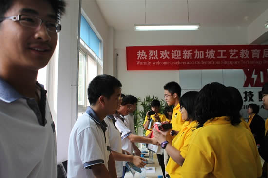 会议伊始,学院党委副书记、副院长陆健安对新加坡来访师生表示了热烈欢迎,学生工作处副处长杨坤介绍了古都西安的厚重历史和我院优秀的办学成果,并一一介绍了今天参加活动的10名优秀学生。新加坡工艺教育西部学院潘老师对我院的精心安排和热情接待表示感谢,并真诚的邀请我院师生去新加坡、去工艺教育西部学院参观交流。接着同学们按照相近的专业进行了友好的交流互动,他们好奇我们的学习生活方式、询问我们从小到大的学制、了解陕西文化和我院文化的特色,由于来访的20名学生中有一部门学生精通英汉双语,所以沟通进行的无比顺畅,开始还有些拘谨的我们,慢慢的敞开了自己,畅所欲言。遗憾的是交流的时间总是过的那么快,依依惜别时,同学们彼此互留E-mail并在E座电子屏前合影留念。之后,在专业讲解人员的带领下,大家从E座到D座,参观了我院教学实习场所,并演示了预备技师班学生的教学成果,获得他们的声声赞叹,频频拍照留念。