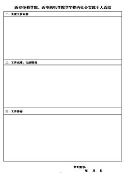 为全面提高校内社会实践活动的质量,一方面更好地为职能部门提供服务;另一方面引导学生充分认识到参加社会实践工作的意义,在思想上高度重视社会实践,行动上积极加入社会实践。学生工作处重新设计了社会实践表格,要求实践指导老师对学生的出勤、工作态度、工作服装、工作效率等全面作出考评;要求学生在实习结束后对社会实践作出书面总结。学生处收集各部门反馈的社会实践表格后统一反馈学生工作处,学生工作处按优良中差给出实践意见后反馈系部,由班主任老师将此表格纳入学生档案进行保存。