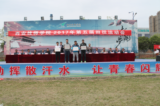 西安技师学院学院第五届田径运动会经过一天半精彩纷呈、紧张激烈的赛事角逐,于4月21日中午11:30举行了闭幕仪式。闭幕式由学生工作处处长崔嵬主持,学院院长李长江、副院长杨广明、赵辉等领导参加闭幕式。