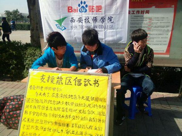 “冬天来了,在高海拔地区冬天是很冷的,在藏区偏远的地方缺少教学设施和过冬衣物,现在我院团委及我院百度贴吧发起倡议,请你将不穿的衣物、不用的文具交给我们,我们将物尽其用……”,这是学院团委和贴吧共同发起的志愿藏区倡议书,向藏区偏远地区奉献爱心活动。