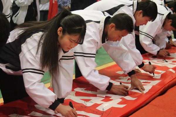 同学们依次在横幅上签下自己的姓名