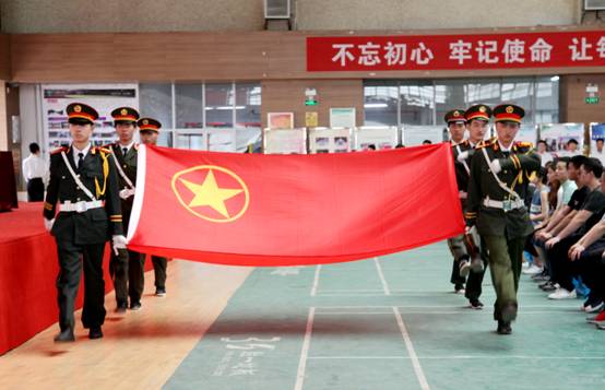 大会在庄严的团歌中开幕,学生会国旗班同学担任旗手将共产主义青年团团旗护送至会场。