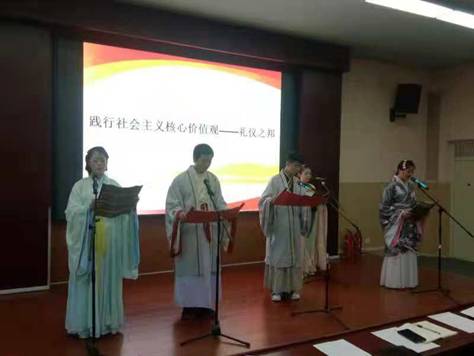 在弘扬传统文化环节里,现代服务系团总支选送的礼仪之邦朗诵和礼仪之邦舞蹈,以歌舞的形式传达践行社会主义核心价值观的重要性;在新时代的召唤环节中,学生代表演唱《共青团团歌》,教工代表孙依盈老师倾情演唱《新时代》。