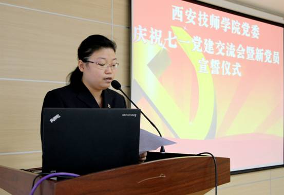 学院党委委员、副院长冯小平代表学院党委宣读了《中共西安技师学院委员会关于批准张依恒等32名同志转为中国共产党预备党员的通知》,对新入党的同志表示衷心地祝贺;在学管中心党支部书记杨兵同志的带领下,全体新发展党员面对党旗庄严宣誓,在场的每一位同志用发自内心的声音宣读入党誓词,抒发了对党组织的忠诚;19WG电力系统班学生袁金金作为新发展党员代表做表态发言,她表示今后将从各方面不断完善自我,以一名共产党员的标准严格要求自己,在日常学习工作中发挥党员模范作用,为党的事业不懈奋斗。