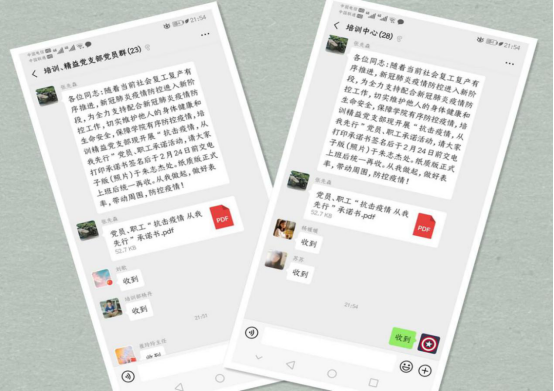 临近新学期开学,为全力支持配合新型冠状肺炎疫情防控工作,切实维护自身及他人的身体健康和生命安全,防止疫情扩散,保障学院有序防控疫情,培训精益党支部近日组织全体党员、职工开展了“抗击疫情,从我先行”承诺活动,大家通过支部及部门微信工作群认真学习疫情防控有关通知文件精神,落实学院疫情防控工作的各项安排,守初心、担使命,以实际行动体现自身的责任和担当,为打赢疫情防控阻击战作出应有贡献。(图文:培训中心 朱志杰)