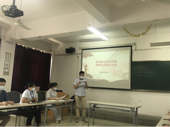 纪检委员张琳娜同志代表支委会介绍了对两位同志在预备期间的教育和考察情况。她表示,两位同志在预备期间思想上积极上进,工作上勤勤恳恳,严谨认真,生活作风优良端正,从教学、教研、技能大赛、招生、培训等方面做出的成绩给与肯定,并代表支委会一致通过他们的转正申请。