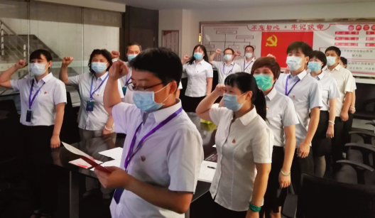 面对党旗,党员示范岗张激磊同志带领全体党员重温入党誓词,大家列队整齐、高举右手进行郑重宣誓,声音嘹亮而又整齐划一。通过宣誓,大家再次重温了党员的基本要求以及对党组织、党的事业所肩负的责任。宣誓是一种形式,更是一种激励,一种鞭策。作为党员,我们要始终牢记在入党举起右手面对党旗宣誓时的初心和使命,栉风沐雨,矢志不渝。