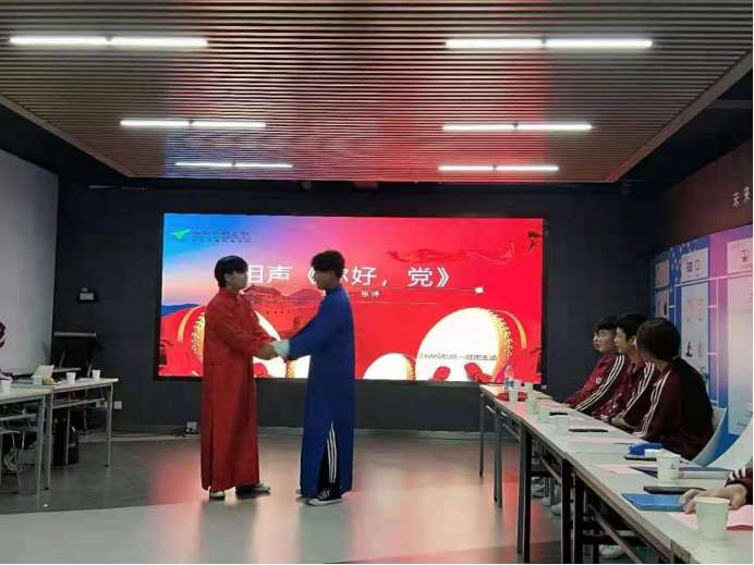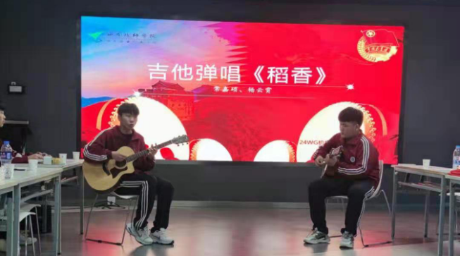 交流会上,24WG机电一班团支部书记吉翔同学以互问互答的方式向大家提出党史小问题,同学们进行抢答,共同学习党史知识;史念同学向大家分享了她参观八路军西安办事处纪念馆的感想心得;最后,全体团员进行了文艺表演。高云普、白岩松和李南杰三位同学为大家带来朗诵《祖国啊,我亲爱的祖国》;尚孝中、宋星宇、李彦锡、李睿琦和武旭同学表演合唱 《团结就是力量》;常嘉硕、杨云霄同学带来吉他弹唱《稻香》;吉翔、李嘉亮和黄一然同学带来朗诵《少年中国说》;王智斌、张博表演了相声《你好,党》。