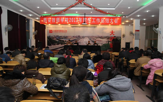 2012年12月14日下午,我院在昆明路校区多功能厅召开了“西安技师学院2012年招生工作总结大会”。院长李长江、院党委副书记、副院长陆健安、副院长王德意、纪委书记、副院长袁建章、副院长赵辉,以及全体中干及教职工参加了会议。大会由袁建章副院长主持。