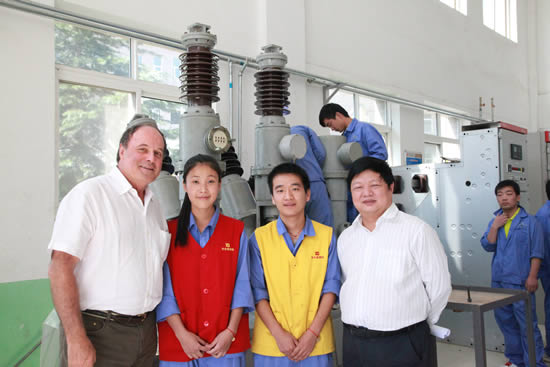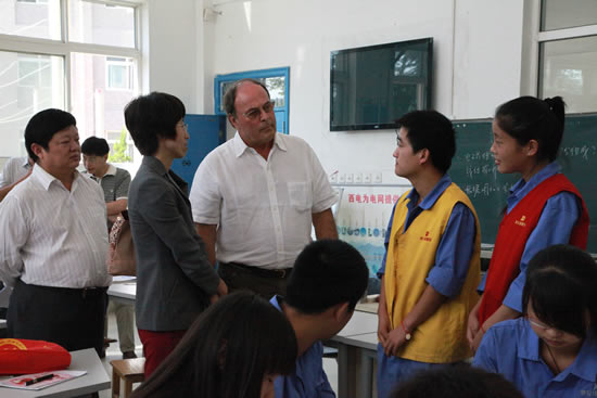 随后,杰克·杜塞尔多普一行在李长江院长的陪同下,参观了高压电气系、工业自动化系、汽车工程教研室的课堂教学与实训中心,以及校办工厂豪特公司生产车间和我院现代化的大型学生餐厅。在高电系实习教室,都塞尔多普主席和正值担任13G输变电高电2班安全员的高阳阳、高晓燕同学的交流中,杜塞尔多普主席问到“你为什么选择这所学校?之前有没有来过这所学校?你了解你的专业吗?”两位同学在回答中对专业的了解和对职业的热爱使杜塞尔多普主席对我院学生刮目相看、连连称赞。当杜塞尔多普主席参观到我院预备技师班的作品展室时,饶有兴趣的亲自操作了我院学生自己研制的塔式起重机模型,并给予高度评价。
