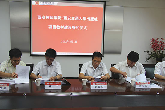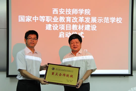 在启动仪式上,学院还与西安交大出版社签订了“西安技师学院国家示范校教材建设合作协议”、“图书出版合同”以及“西安交大出版社重点合作院校合作协议”,林全社长代表西安交大出版社向学院颁发了“西安交大出版社重点合作院校”牌匾。