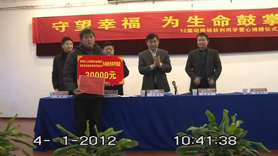 学院2012届幼儿师范专业中专学生杨秋利同学被西京医院确诊为淋巴急性白血病,需进行造血干细胞移植,方可痊愈,巨额的开支远远超出其家庭的承受能力。学院得知消息后,第一时间在全院范围发起“捐献爱心互帮扶困”的倡议,得到了全院师生的积极响应。在捐赠仪式上,陕西省人力资源和社会保障厅副厅长沙德宪将陕西省技能扶贫助学基金会捐赠的2万元交与杨秋利同学的家人,鼓励家人树立信心,勇敢面对困难。学院院长李长江代表学院捐赠2万元爱心善款。杨秋利的家人接收了捐款,代表杨秋利及全家感谢陕西省人力资源和社会保障厅、陕西省技能扶贫助学基金会等相关部门和领导,感谢西安技师学院和全院师生对于杨秋利的关怀和对自己家庭的大力帮助!