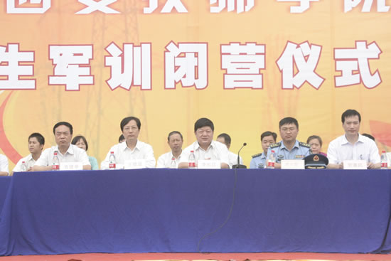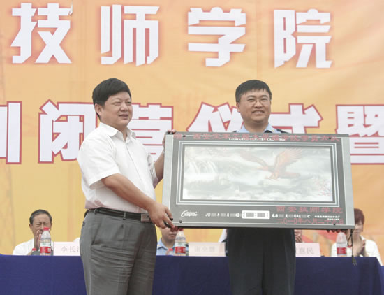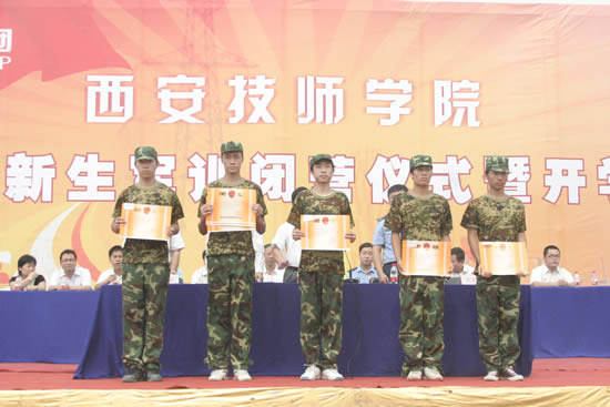 学院院长李长江发表热情洋溢的讲话,首先代表学院向全体空军工程大学承训官兵表示深切的问候,对新生们表示热烈的欢迎和祝贺。接着,他介绍了我国技能教育的历史和学院发展现状,他希望同学们在今后的学习中,继续保持军训中的优良作风,学会做人、学会做事、学会共处。用军训中所锤炼出来的那种坚强的精神、顽强的毅力和严格的组织纪律性,一步一个脚印,扎扎实实走好技能学习的每一步。随后,学院副院长王德意宣读军训优秀学员名单,学院领导对180名优秀学员进行了颁奖。院长李长江向空军工程大学赠送牌匾,感谢他们在军训期间所表现出英武的军人风范,感谢他们在军训中为我院新生所付出的汗水和辛劳。