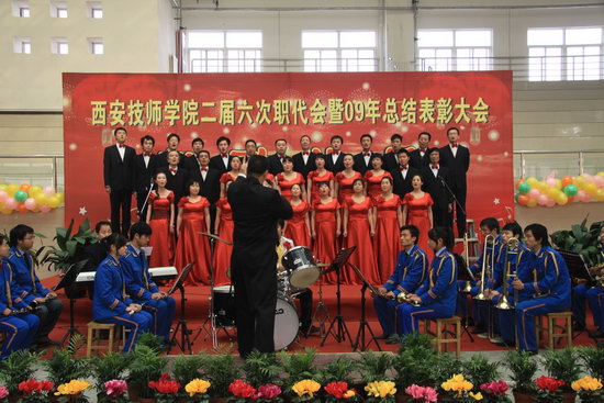 2010年1月15日,咸阳校区文体餐饮中心内鲜花锦簇、彩球缤纷,一派喜庆、热烈的气氛,我院二届六次职代会暨2009年总结表彰大会在此隆重召开。学院领导院长李长江、党委副书记工会主席袁建章、副院长王德意、副院长贺惠民、正式代表49名、列席代表5人及全体教职工出席会议。
