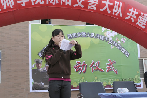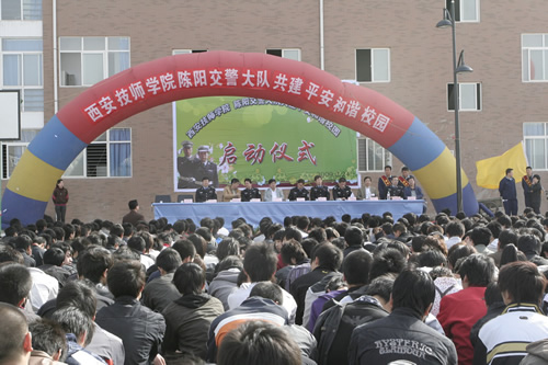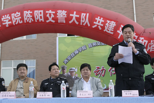 李长江院长在启动仪式上致辞,他指出,学院要以此次警民共建平安和谐校园启动仪式为契机,把校园安全、财产安全、师生人身安全作为一项重要工作来抓,牢固树立安全意识,为社会培养高技能人才,推动地区经济建设和社会发展不懈努力。陈阳交警大队孙维弟教导员做了交通安全报告,他号召全体师生都要认真学习交通安全知识,树立现代公民交通文明意识。学院学生代表做了“珍爱生命,遵守交通规则”的发言。咸阳市交警支队副支队长贾必胜作了重要讲话,他再次强调了交通安全进校园的重要性,希望通过此次警民共建平安和谐校园,促进交通安全进学校系列活动的开展。