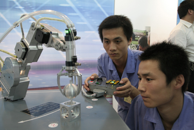 学院预备技师班毕业生正在调试自己设计制作的多功能机械手